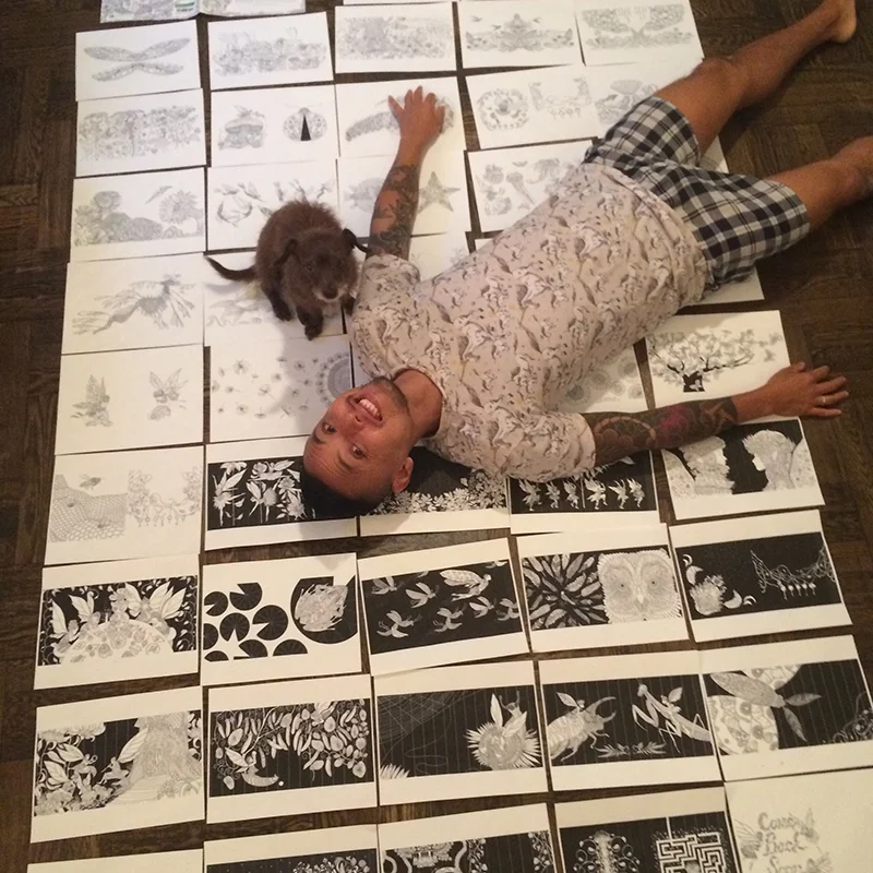 ... okay... let me back track a bit... no, I haven't written stories about my process, but the images below are snidbits of the time that I spent working on this project... The drawing were almost entirely all hand-drawn onto 22 x 30" sheets of 140lb and 300lb Saunders Waterford Hot Press Watercolour paper, using Dr. PH Martin's Black Star Matte India Ink as recommended by my good friend Yuko Shimizu