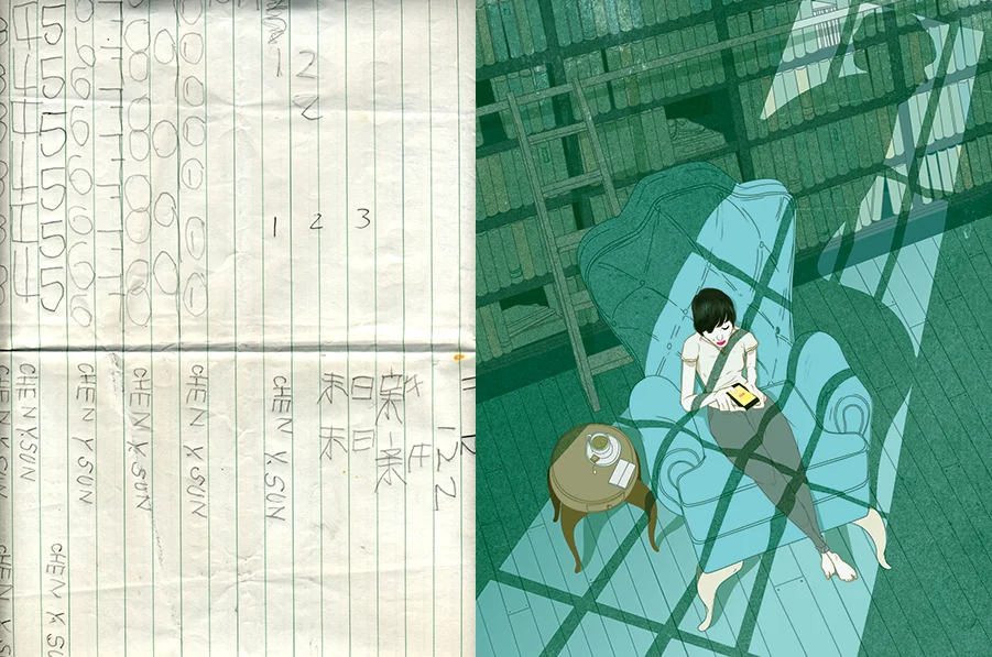 My grandmother and I spent a lot of time together, and at a very young age, I had the privilege to witness at close range, the aging process. She arrived to Canada being able to stand and walk with a cane. But slowly, over the years her body began to break down because of arthritis, and so she needed the support of a wall, desk, or railing to help brace her while she moved. Eventually her body became so old that she spent most of her time in the bedroom, and because of her extreme immobility my father filled her room with everything she might need to keep her comfortable. A rice cooker, cookies and snacks, bread, hot water, tea, a television, papers and pencils, and magazines. To pass the time, my grandmother and I played boardgames, where she sat and rolled the dice and then watched me move both her and my figurine across the board. We played Bingo, where I was both the announcer and the players, filling my card and hers with plastic chips. Sometimes we watched exercise programs on television and my grandmother, seated, would raise and lower her arms over and over again, and then kick her feet in and out, the way you might on the edge of a dock, or swimming pool. At lunch time, when I was in elementary school, I would go home to see her. I'd make lunch and then walk upstairs to her bedroom and sit on her bedside and eat. She usually sat in her armchair next to a broken Singer sewing machine that we used as a table. My family and I also taught her how to write her name and some numbers in English,